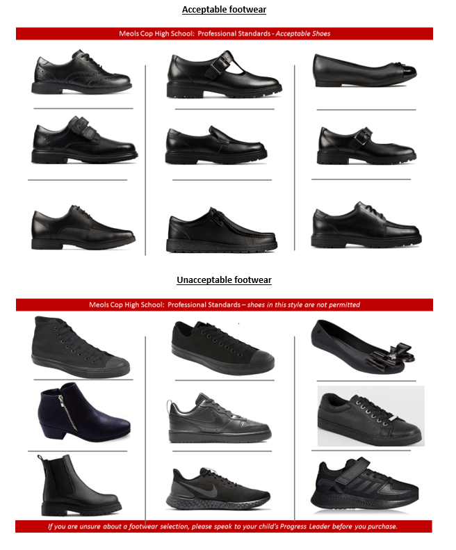 - Black polished school shoes, with no logos or motifs. Shoes must be flat. Boots and trainers are not acceptable. If a student is wearing the wrong footwear, parents / cares will be contacted and a sanction will be issued.